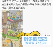 成功邀请其他青蛙来做客方法: 蛙爸蛙妈们需要你家蛙儿子出现的行李或桌子上放上 幸运铃和蓝玉 。但是幸运铃的价钱并不便宜,需要花费3000颗三叶草才能购买,所以这也就需要玩家收集足够数量的三叶草才能购买幸运铃。蓝玉则是需要抽奖获取了,但是抽到的蓝玉的概率并不是很高,等于要同时做到两样需要玩家爆棚的运气啊。 以及抽出来的不知道会去向哪里的御守,你家的青蛙出门后就会带三只青蛙回到家里了。 在这里,小编偷偷告诉你们,我们养的蛙应该是只公的呦,还会带小母蛙回家哦。