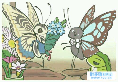 第三张是自己的蛙崽子扮演单身狗的角色,在一边默默看着两只蝴蝶互相告白。可以看到,一只灰色蝴蝶跟白色蝴蝶碰面后,白色蝴蝶给了一束花给灰色蝴蝶。反观蛙崽子,就只能在地上眼巴巴地看着,着实好笑有木有。这张明信片也是很难收集,因为小曼君玩了这么久的旅行青蛙,还没看过。