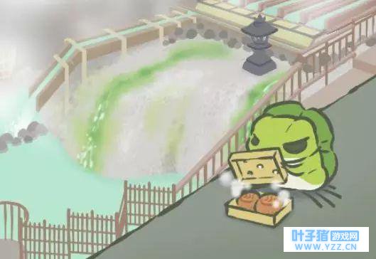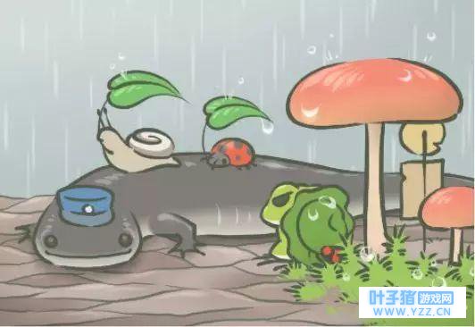 定睛一看,这幅图也是满满的爱。带着制服帽的大鲶鱼,确实像个海边公交背上驼了一只蜗牛和瓢虫,还打着伞,我们的蛙就在蘑菇站台下等,超萌有没有! 除此之外,我们的蛙蛙还特别能享受,比如 它还去温泉 。