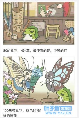 如果用80的食物+4叶草+最便宜的碗+中等的灯具,那么就会开启这一张和大老鼠合照的SSR级别的明信片。照片中“青蛙儿子”一脸的呆萌正在学习毛笔字,但是看这现场的痕迹,显然学习的过程并不友好。同时,用100的热带食物+桃色的抽奖袋+最好的头巾+最好的帐篷,那么自己的青蛙宝宝就会碰到两只“蝴蝶妹妹”,照片中三个小动物相处的其乐融融,十分融洽!