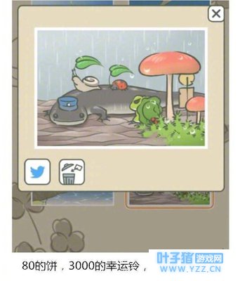 同样在游戏中使用“80的饼干+3000的幸运铃+最好的碗以及最好的灯具”那么就能开启这一张的SSR级别的明信片。明信片中青蛙儿子在下着小雨的天气遇到了其他的小动物。满满的有爱画面。