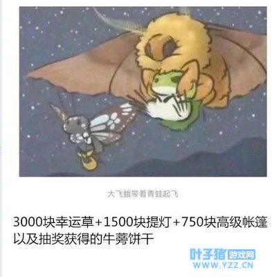 很多网友表示:使用3000块幸运草+1500快的提灯+750块的高级帐篷以及在抽奖中得到的牛蒡饼干。就能获得在游戏中的稀有SSR明信片——大飞蛾带着青蛙起飞的照片。在游戏中的明信片中我们可以看到肥胖的“大飞蛾”张开了自己的翅膀带着青蛙宝宝在天上欣赏风景,而青蛙宝宝显然是吓“坏”了,旁边还有蝴蝶妹妹在提着灯。