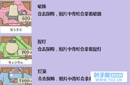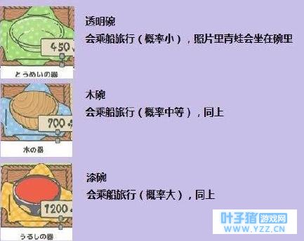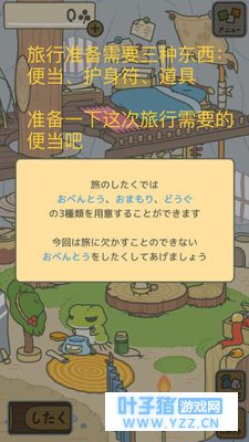 关于道具:我们先要给蛙儿子准备便当、道具和护身符,蛙儿子出门旅行便当是必需品噢,这样蛙回家的时候会带来礼物给我们,而道具和护身符的话,则有可能会对蛙的旅途产生影响(也就是目的地和时间会变化啦)。1.可以开始选择给蛙的包袱和桌子上准备东西,注意噢:包袱是蛙旅行时带走的行李,桌子上的是备用品。这样万一它旅行回来时你没有来得及给他准备,它自己就会把桌子上的收进包袱里出发~ 2.这边要特别注意,如果包袱和桌子上一直都没有为它准备东西的话,蛙就会离家出走不回家哦!这种情况下我们只需要重新准备东西它就知道回家啦。 3.如果你提前在桌子上给蛙准备好东西,蛙会在旅行途中寄回来照片,也就是明信片。不用担心它不惦记家。回来会给你带来各地的逸品和名特产作为礼物。照片可以在相册里看。 4.哇咔咔,没错,偶尔也会有蛙的小伙伴来串门喔~!这时就可以用名特产来招待它的盆友~然后也能收到伙伴的回礼~