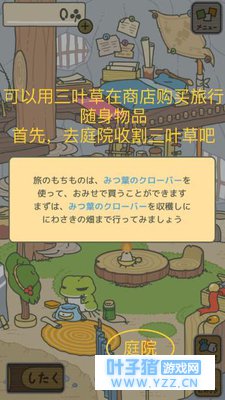 三叶草的用途呢就是可以在商店里为它买东西~相当于货币,可以买各种食物、碗具、水壶灯笼等道具,给蛙作为出门的装备,当然东西越好,走的越远。不同的食物决定了偶尔还会得到抽奖券喔,五张抽奖券就可以抽一次奖~