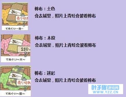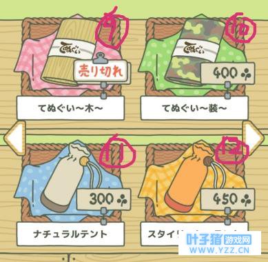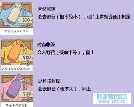 9、树色的包袱皮(250棵草),适合去街上玩儿 10、迷彩色的包袱皮(400棵草),很时尚受欢迎,适合去街上玩儿【反正包袱就是去街上玩的,可以催你的呱呱出门】 11、入门帐篷(300棵草),让野营变得容易 12、标准帐篷(450棵草),时尚受欢迎,野营变容易