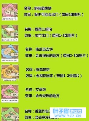 1、烤饼(10棵草),最简单的主食,吃完有点饿就出门了…… 2、巨石三明治(20棵草),快餐,草草了事 3、南瓜百吉饼(50棵草),份量很大的餐点,能【会】让蛙去很远的地区旅游,每次用这个我的蛙都能出去好久 4、乳蛋饼(80棵草),口感非常好,所以蛙会早早回来