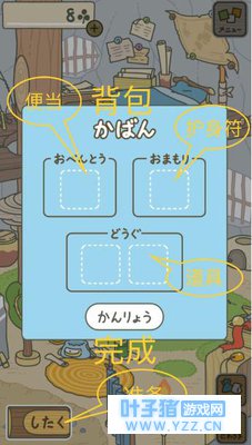 【整理背包】背包由三个部分组成: おべんとう(便当) おまもり(护身符) どうぐ(道具) 按照图片指示整理好背包点击「かんりょう」(完成)就好啦。