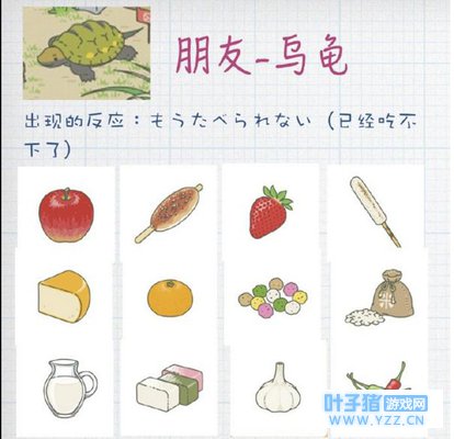 乌龟: 乌龟喜欢吃大葱、柿子、水、栗子、茶、温泉馒头。 乌龟不喜欢牛奶、白菜、苹果、草莓、桔子、五色豆。