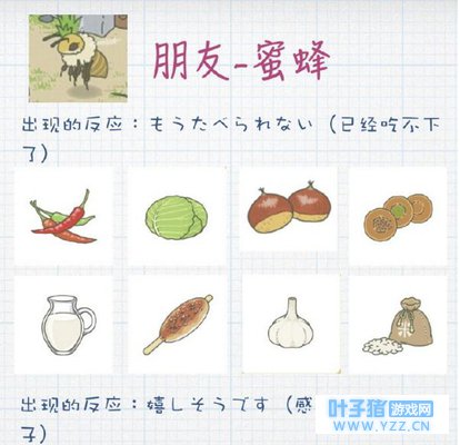 相信很多小伙伴第一次见到青蛙的朋友来家里做客,都有点不知所措,不知道如何招待他们。 想要知道如何招待他的朋友们,那就得知道这些吃的东西究竟是从哪来的。 其实也很简单,只需要让青蛙不断的去不同的地方旅行,就会带回来不一样的特产和点心。如果需要某种特定的特产,就需要先搞清楚这个特产是去哪儿旅行带回来的,下次再带上同样的便当和道具去同样的地方,自然也就能收到同样的特产了。 在青蛙的朋友造访,点击它们,然后就会出现特产列表,选择青蛙朋友喜欢的相应东西给予他们就行了。 目前出现了蜗牛朋友,蜜蜂朋友和乌龟朋友,每一个朋友的喜好都不太一样,因此要根据他们的喜好进行投食,而不能随便喂,如果为了她不喜欢的食物,可能会不给你回礼,下面我就教大家怎样才可以得到最大的回报。 蜗牛: 蜗牛爱吃的有辣椒、洋葱、大蒜、大葱、卷心菜、温泉馒头、米、奶酪面包、牛奶。