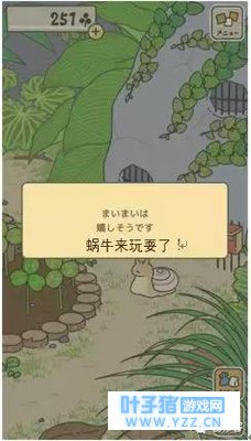 动物到访: 庭院里经常会有蜗牛、蜜蜂、乌龟等动物到访,点击动物可以使用青蛙旅行带回来的特产招待它,蜗牛吃卷心菜、辣椒会开心,会给很多好东西;蜜蜂喜欢吃水果特别是草莓,乌龟喝茶。之后小动物会寄来回礼,在邮筒中会有提示。 来玩耍的蜗牛: