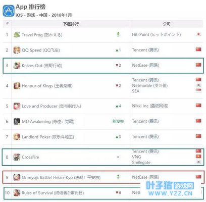 2.与《王者荣耀》对垒,《决战!平安京》跃至中国iOS游戏下载榜第9 从中国iOS游戏下载榜中可以看到,除了《旅行青蛙》排名大幅飙升之外,《决战!平安京》也进入了榜单第九。