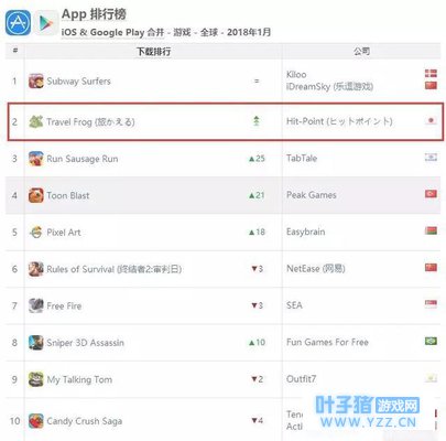 回顾近段时间国内手游市场情况,会发现不论是产品还是厂商节奏都变得更快,细分领域爆款频出、榜单排名变幻莫测,跟风模仿的产品竟然都赶不上热度聚焦点的变化。2018年年初,大厂之间“吃鸡”仍旧打得火热、经典端游改编的手游《QQ飞车》在竞速领域一骑绝尘、《旅行青蛙》、《恋与制作人》引爆社交网络,女性向游戏市场获得莫大关注...... 那么,这些产品在市场上的具体表现如何?近日,App Annie公布的2018年1月手游指数报告或许能给读者提供一份客观的数据,手游那点事将以产品为重点进行解读,以及除了上述给大众留下深刻印象的产品之外,还有哪些是值得关注的? 一、这些游戏的下载量出乎意料 1.《旅行青蛙》全球下载榜第2,堪称放置类游戏巅峰之作 和以往每月榜单情况一样,游戏下载榜TOP10排名变动幅度比较大,新品的上榜与老产品的回落交替频繁。 而在1月份的游戏下载榜中,最惹眼的无疑是Hit-Point研发的《旅行青蛙》,成为小厂推出爆款的又一个案例。从1月9日开始,《旅行青蛙》在国内市场热度逐渐攀升,社交平台上围绕这款游戏的讨论也未曾停止过。凭借在国内市场取得的成绩,《旅行青蛙》在1月份的iOS&Google Play全球下载榜中排第二,仅次于《Subway Surfers(地铁跑酷)》。而从中国iOS以及全球iOS游戏下载榜来看,《旅行青蛙》都拿下了榜单第一。