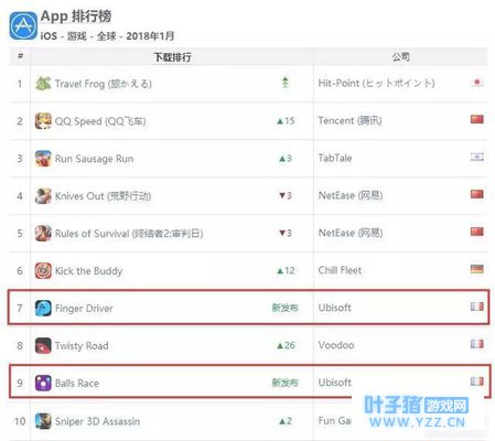 观察中国与全球iOS游戏下载榜TOP10会发现,后者榜单上的休闲游戏占更大比例。其中,育碧的两款新游《Finger Driver》、《Balls Race》进入了全球iOS游戏下载榜TOP10,分别位列第7、第9名,这两款游戏都是由育碧旗下知名休闲游戏厂商Ketchapp制作。《Finger Driver》是一款需要玩家旋转方向盘驾驶汽车,在一次次撞墙中摸索的魔性游戏。而《Balls Race》同为休闲益智游戏,玩法也比较简单,在布满障碍物的跑道上,玩家需要控制高速前进的小球,避免与其他物体相撞,这款跑酷类游戏同样也聚集了不少玩家。