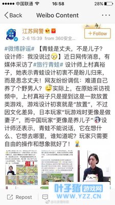 @江苏网警在微博中称,实际上,在原始采访视频中,《旅行青蛙》的设计者上村真裕子只是提到这是一款放置类游戏,游戏设计初衷就是 “放置” 。 其实在专访中,设计者上村真裕子自个儿都是懵逼状态。对于这个游戏在中国的火爆更是有点儿不知所措。要知道,《旅行青蛙》虽然没有中文版,但是在苹果商城里,却有95%的下载是来自中国玩家,日本玩家的下载只有1%。