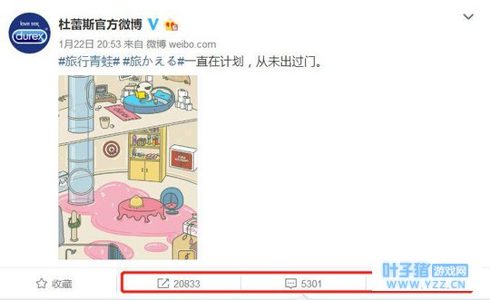简单来说, 就是一个老母亲在家巴巴 等 蛙儿子旅行归来的故事。 一只给它取了名字并非亲生的蛙, 却勾起了千万老母亲牵挂的心。 而有热点的地方, 就有杜蕾斯。 作为热点营销天下第一的杜蕾斯, 第一时间发布了一张借势海报, 画面文案炸裂。 官方微博评论区抱拳佩服声一片, 当即这条微博的转发和点赞就破万, 创2018年新高。