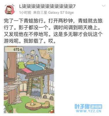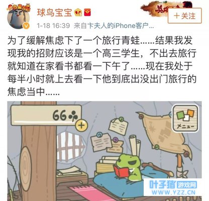 网友帅气牛头人说:焦虑症不适合玩旅行青蛙啊,老控制不住自己打开,然后发现三叶草还没出现,呱呱也没回家。 网友丹青大书渣说:下载了10分钟就卸载了,这个游戏会让我焦虑.... 网友王叔叔养了只猫说:本来以为养蛙是排解孤独的结果养了蛙发现越来越孤独了,崽根本不回家!