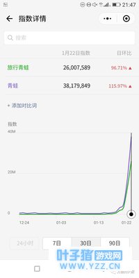 亲戚圈层(含邻居和酒吧约pao等地域带来的关系); 同学圈层; 工作圈层(同事、前同事、同行、客户、合作商等); 同好圈层(驴友、电竞好友); 以上4类关系的延伸,比如你同事的老公。如果“旅行青蛙”手游击穿了以上所有圈层,即全民刷屏。 由于信息茧房的关系,三种刷屏,都需要有数据支撑,比如PV和UV,微信指数也是一个关键指标。 根据上面的定义,我们再来看“旅行青蛙”的刷屏,显然是第二种,即跨圈层刷屏,懂的人会心一笑,哎哟,你也在玩。不懂的人很懵逼,这只青蛙这么丑,为啥大家都在晒。 从微信指数来看,“旅行青蛙”和“青蛙”这两个词在过去几天出现暴涨,也印证了刷屏的结果。