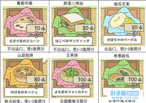 食物解析: 葡萄司康(えびづるのスコーン) ·价格:10个三叶草 ·作用:便当的分量比较小,供不想让自己的青蛙出远门的玩家选购,只能带回1张照片 野菜三明治(はこべのサンドイッチ) ·价格:20个三叶草 ·作用:份量比葡萄司康多一点,同样适合不想让小蛙出远门的玩家,只能带回1至2张照片 南瓜贝果(かぼちゃのベーグル) ·价格:50个三叶草 ·作用:对比前面两种便当分量较多,适合想让小蛙旅行久一点的玩家,可以带回2至3张照片 山蒜咸派(のびるのキッシュ) ·价格:80个三叶草 ·作用:份量很多,奇怪的是可能因为太好吃了青蛙会很快的回家,并带回1至2张照片 艾草饼(よもぎのフォッカチャ) ·价格:100个三叶草 ·作用:份量是所有便当中最多的,会让吃了的小青蛙去温暖的地方旅行,像是南方或有温泉的地区 香葱面包(あさつきのピロシキ) ·价格:100个三叶草 ·作用:份量同样是最多的,相反的会让小青蛙往寒冷的地方出发,像是北方或会下雪等地区 道具解析: 幸运铃铛(幸运の铃) ·价格:3000个三叶草 ·作用:能够为小青蛙带来好运,虽然很贵可是可以无限次使用,与四叶草相似,还可以让青蛙儿子带回更多的土特产。 土色头巾(てぬぐい~地~) ·价格:150个三叶草 ·作用:寄给我们的照片上的青蛙会戴此头巾,会有较小的几率到城市去旅游 木纹头巾(てぬぐい~木~) ·价格:250个三叶草 ·作用:寄给我们的照片上的青蛙会戴此头巾,会有较大的机率到城市旅行 迷彩头巾(てぬぐい~装~) ·价格:750个三叶草 ·作用:寄给我们的照片上的青蛙会戴此头巾,会有较大的机率到城市旅行