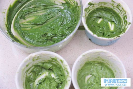 ③ 黄油霜均分成四份。第一份加2g抹茶酱,第二份加4g,第三份加8g,第四份加16g,全部搅匀后,分别填入裱花袋。