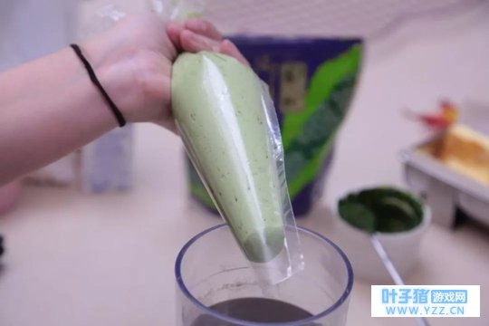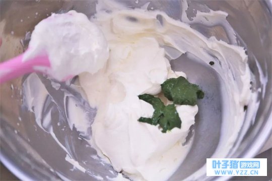 ② 抹茶粉加热水用茶筅搅拌成抹茶酱。 将抹茶酱加入奶酪奶油霜中搅拌均匀,填入裱花袋备用。