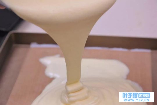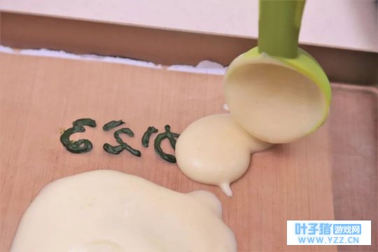 ⑤ 取出冷冻好的图案,把 蛋糕面糊先用勺子舀一些填在青蛙图案上、轻轻抹平(这一步是为了防止图案跟面糊之间产生气孔),然后把剩下的面糊倒入烤盘,震出面糊中的气泡。