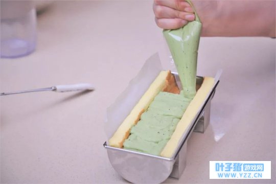 ⑤ 将画好的图案冷冻,至蛋糕卷面糊完成。 制作抹茶内馅: ① 淡奶油加入糖粉打至8-9分发,分次拌入马斯卡彭奶酪。