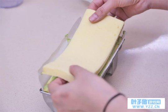 ④ 将长条蛋糕片盖上,冷藏30分钟(或冷冻10分钟),取出倒置脱模,蛙儿子蛋糕卷就完成啦!