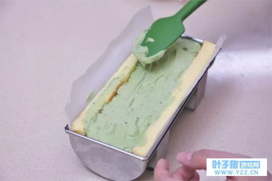 ② 将画着蛙儿子的那一面朝下,垫上一层等长裁好的烤纸,放进模具中,紧贴模具表面。