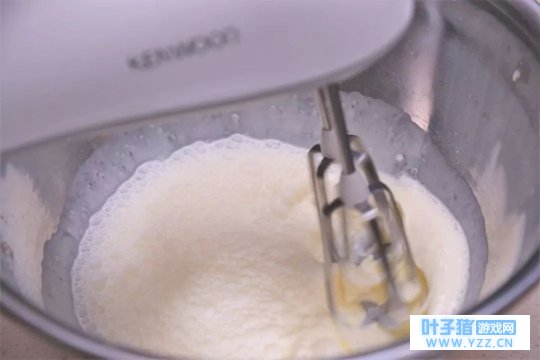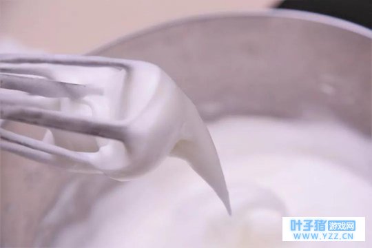 ③ 将蛋白从冰箱取出,分三次加入细砂糖,打发至湿性发泡。