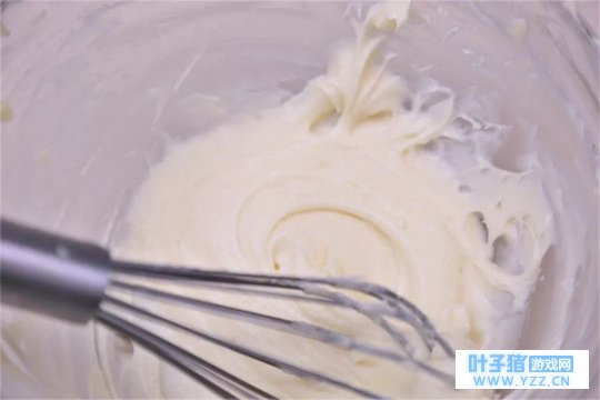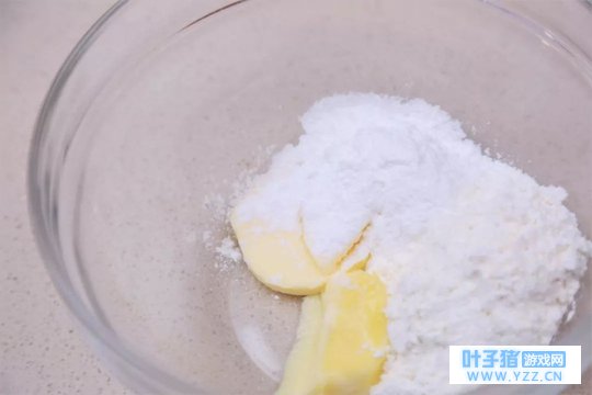 ② 黄油软化后,加入糖粉、低筋面粉拌匀,再加入蛋白搅匀。