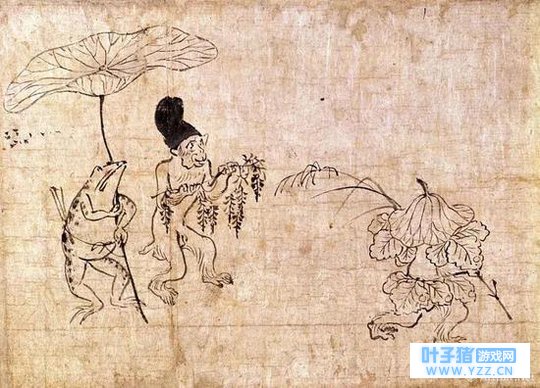 放下手机来到国立西洋美术馆时,我并没有料到在这里也能看到出门旅行的青蛙寄来的“明信片”。眼前的朝颜花朵温婉,藤蔓舒展,青蛙藏身于叶间,笃定的神情也与游戏中那只小青蛙颇为相似。而此次展览中描绘青蛙的作品远不止于此。 在我们与它相遇的很久很久以前,它就已经去过许多地方旅行了。 01 自古以来,青蛙就是为日本人熟知和喜爱的小动物。 松尾芭蕉写过俳句“闲寂古池旁,青蛙跃入水中央,扑通一声响”,日本平安时代末期的鸟兽戏画中也时常出现青蛙拟人的生动形象。由于日文中的“青蛙”(カエル)与“归来”(帰る)谐音(《旅行青蛙》的标题也利用了这一谐音),如今的日本交通广告中也经常使用青蛙的形象来表达平安回家的寓意。
