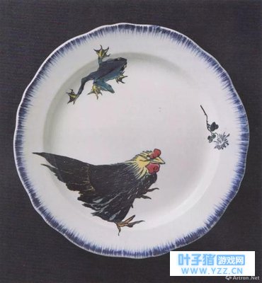 1867年举办的巴黎万国博览会中展出了餐具套盘“Rousseau”,大受好评,其他陶艺师纷纷效仿,北斋的花鸟鱼虫一下子成了最时兴的装饰纹样。 在当时的西方,人们本来就习惯将禽鸟游鱼等用作食材的动物绘制在餐具上,然而“Rousseau”将两栖动物用作餐具装饰则是崭新的创举。下图是 1867年制造的“Rousseau”套盘之一,餐盘上的鸡和青蛙都照搬自北斋的作品。