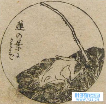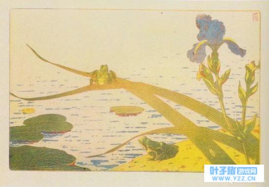 图为鸟兽戏画中拿荷叶当伞的青蛙。 而北斋笔下的青蛙不仅像游戏中那样走遍了日本,更是早在十九世纪后半叶江户幕府对外开放时就跟着洋大人们来到了欧洲和美国。 北斋的风格与西方绘画完全不同,许多介绍日本艺术的画册都竞相收录他的作品,西方人对北斋的评价也逐渐由“有意思的画家”转变成为“日本最伟大的画家”,对印象派和新艺术运动产生了不可忽视的影响。 1886年于伦敦出版的《日本绘画艺术》中收录了北斋的作品,画中描绘了拖家带口的旅行青蛙,一只背着呱娃儿,一只抱着花。