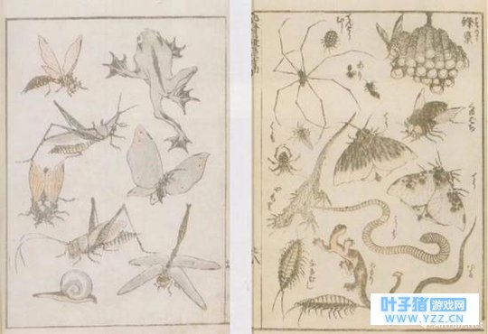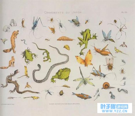 巴黎出版的《日本装饰艺术素描集》中也能见到北斋的青蛙的身影。图中还出现了许多青蛙的小伙伴,你可曾收到过它们的明信片?