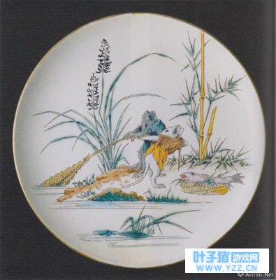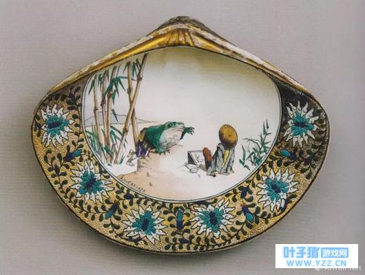 下图餐盘上的画家被穿着裤子的蟾蜍吓了一跳,蟾蜍同样出自北斋的手笔。