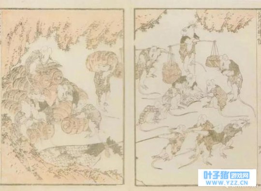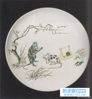 03 青蛙的小伙伴们自然也是北斋笔下的常客。《北斋漫画》十篇中描绘了一群姿态各异的老鼠,有的读书,有的挑担,有的打渔,和旅行青蛙稀有明信片中出现的老鼠一家子有几分相似。 法国波尔多的陶瓷工作室Jules Vieillard从中得到灵感,将画中老鼠两两组合,再配上从《北斋漫画》的其它作品中引用的竹节等图样,制造出一系列以鼠为主题的瓷盘。