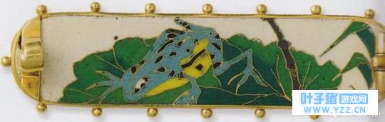 当时的绘画和装饰品中也能见到青蛙的身影,下面这枚胸针上的青蛙纹样就出自北斋的弟子葛饰为斋。