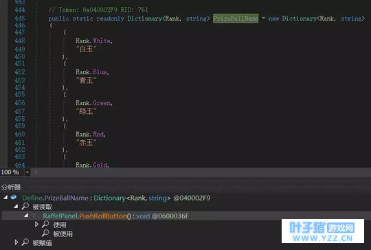 public static readonly Dictionary<Rank, string> PrizeBallName = new Dictionary<Rank, string> { { Rank.White, "白玉" }, { Rank.Blue, "青玉" }, { Rank.Green, "緑玉" }, { Rank.Red, "赤玉" }, { Rank.Gold, "黄玉" } }; 右键点击PrizeBallName选择分析找到在那里被使用的: