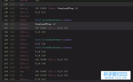 public GameObject NewCloverObject(int index, CloverDataFormat cloverData, List<GameObject> cloversObj, bool fourLeafFlag) { Vector2 size = base.GetComponent<BoxCollider2D>.size; PolygonCollider2D component = base.GetComponent<PolygonCollider2D>; Vector2 vector; vector..ctor(base.GetComponent<BoxCollider2D>.offset.x - size.x / 2f, base.GetComponent<BoxCollider2D>.offset.y - size.y / 2f); int num = 0; bool flag; Vector3 vector2; do { flag = false; vector2 = new Vector2(vector.x + Random.Range(0f, size.x), vector.y + Random.Range(0f, size.y)); if (!component.OverlapPoint(vector2 + base.transform.position)) { flag = true; } else { for (int i = 0; i < cloversObj.Count; i++) { Vector2 size2 = cloversObj[i].GetComponent<BoxCollider2D>.size; if (Mathf.Abs(vector2.x - cloversObj[i].transform.localPosition.x) < size2.x / 2f && Mathf.Abs(vector2.y - cloversObj[i].transform.localPosition.y) < size2.y / 4f) { flag = true; } } num++; if (num >= 100) { break; } } } while (flag); GameObject gameObject = Object.Instantiate<GameObject>(this.basePrefab, Vector3.zero, Quaternion.identity); CloverDataFormat cloverDataFormat = new CloverDataFormat; cloverDataFormat.point = 1; cloverDataFormat.element = 0; //如果第四个参数是false,这里就是四叶草生成的概率,是fourLeaf_percent是1那这个概率就是1/100 if (Random.Range(0f, 10000f) < this.fourLeaf_percent * 100f) { cloverDataFormat.element = 1; } //如果传了这个参数为true直接生成四叶草 if (fourLeafFlag) { } int element = cloverDataFormat.element; if (element != 0) { if (element == 1) { cloverDataFormat.spriteNum = Random.Range(0, this.fourCloverSprite.Length); gameObject.GetComponent<SpriteRenderer>.sprite = this.fourCloverSprite[cloverDataFormat.spriteNum]; } } else { cloverDataFormat.spriteNum = Random.Range(0, this.cloverSprite.Length); gameObject.GetComponent<SpriteRenderer>.sprite = this.cloverSprite[cloverDataFormat.spriteNum]; } gameObject.GetComponent<Clover>.SetCloverData(index, cloverDataFormat); gameObject.transform.parent = base.transform; gameObject.transform.localScale = Vector3.one; gameObject.transform.localPosition = vector2; return gameObject; } 那么这里既可以修改四叶草生成的概率也可以修改 fourLeafFlag这个为true,第一种方式和上面一样,看看第二种。右键fourLeafFlag编辑IL指令: