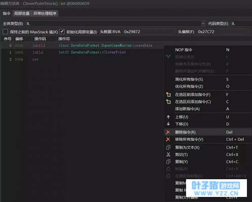 public static int CloverPointStock { return SuperGameMaster.saveData.CloverPoint; } 这里返回的是一个从saveData.CloverPoint中获取的整数,可以尝试将其修改成返回一个特定的数字每次查询三叶草的数目都是这么多,右键点击编辑IL指令,然后点击重置并右键删除第一条指令,因为只是返回一个数字的话两条指令就够了: