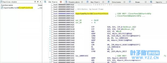Making method name... Make method name done Setting String... Set string done Making function... Make function done, please wait for IDA to complete the analysis Script finish ! 根据函数hook代码还原之后就可以根据之前分析到的函数名来hook对应的代码了,首先是三叶草的数目通过SuperGameMaster.CloverPointStock获取的,在IDA搜索CloverPointStock如下: