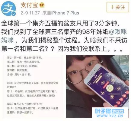 全球第三名集齐五福 仅用4分钟据支付宝介绍,全球第一个集齐五福的小伙伴,只用了3分多钟,他们还对第三名进行了采访。为啥不采访第一名和第二名?支付宝称因为没联系上......