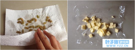 步骤: 1、 葡萄干提前用热水泡软后,再用厨房纸巾吸干水分。 2、 黄油切成小粒状,室温放软。