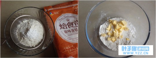 3、 将面粉、泡打粉、盐混合后过筛一次。 4、 加入黄油和糖。