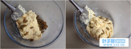 7、 用刮刀切拌,加入葡萄干。 8、 拌均匀。