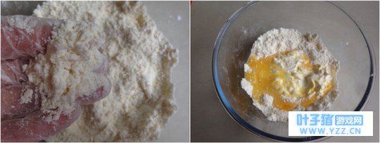 5、 用双手搓成粗玉米粉状。 6、 加入蛋液和淡奶油。
