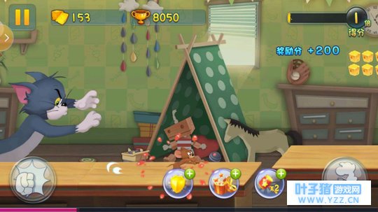 和动画片里一样,猫在追,鼠在逃,偶尔还会召唤大狗狗来对付猫。 游戏操作很简单,你做为杰瑞在逃跑的同时要 吃掉足够的蛋糕 ,还要 躲避汤姆的攻击 ,在适当的时候还要 反击 ,一直跑到终点没有被抓住就算赢了。