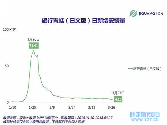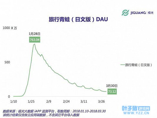 根据极光大数据显示,进入2月后,《旅行青蛙》热度下降,渗透率、DAU(日活跃用户)、新增安装量出现全面下跌。截至3月30日,《旅行青蛙》日文版中国地区DAU约为73万,不足1月28日游戏DAU峰值763万的10%。在这种情况下,阿里想让青蛙再次火起来,具有相当大的难度。 |