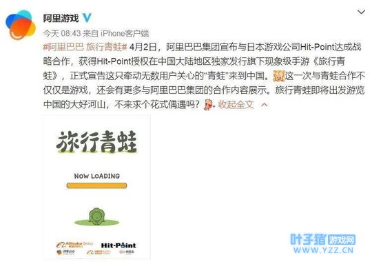 4月2日,阿里游戏正式宣布与日本游戏公司Hit-Point达成战略合作,获得该公司授权,将独家代理旗下的现象级手游《旅行青蛙》,以及中国大陆地区的发行业务。