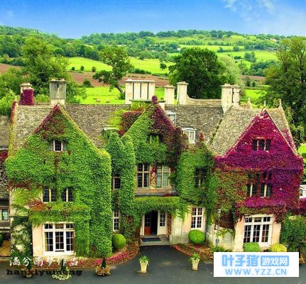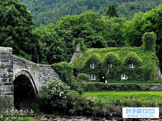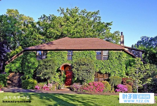 从图中可以看出,屋顶墙上有爬山虎类似的藤类植物覆盖,周边种植了花草树木,绿化很好,典型的庭院景观。